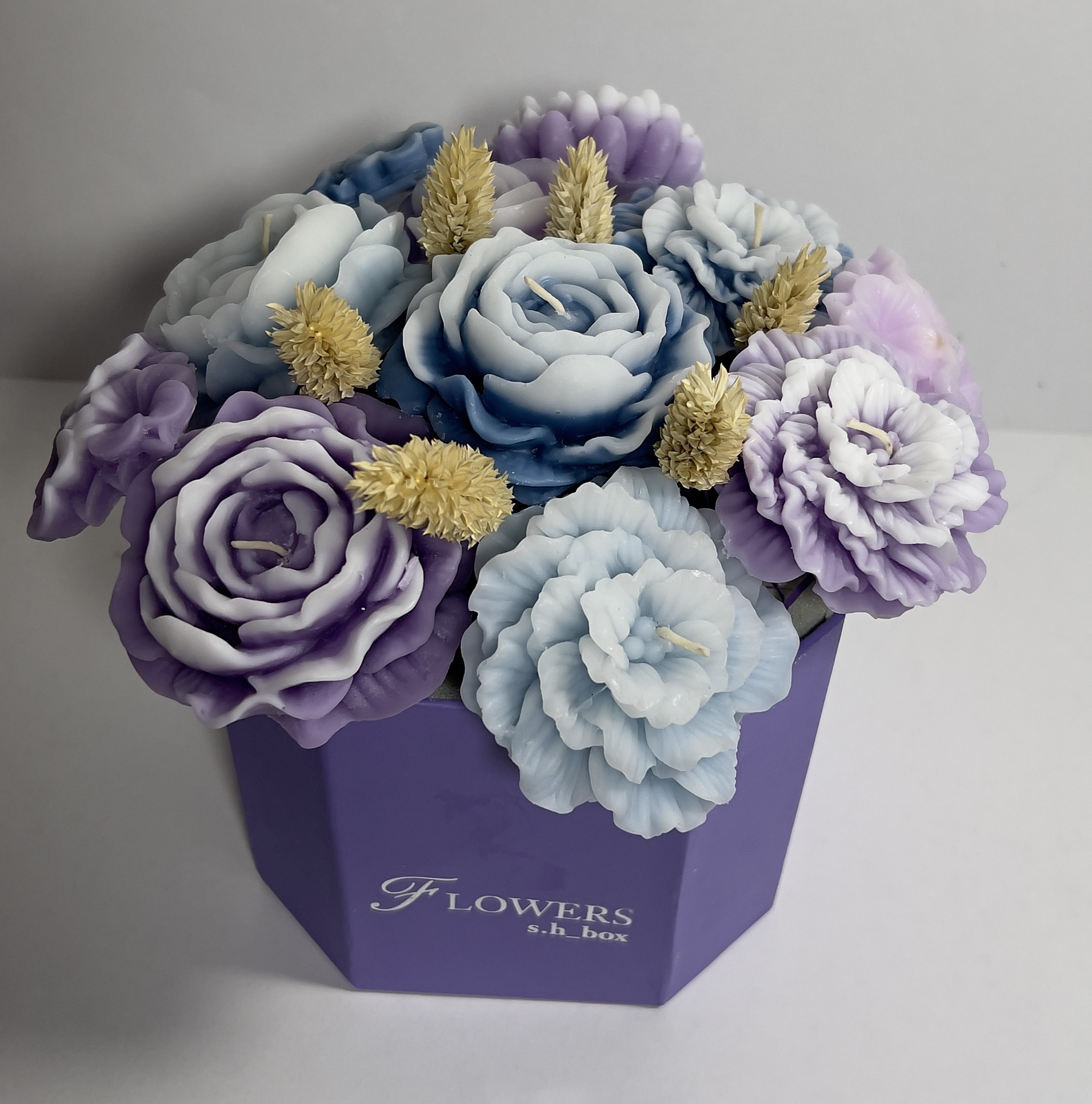 💜💙باکس شمع گل یک انتخاب خاص وجذاب برای هدیه دادن است💙این گلهای شمع زیبابا قرار گرفتن در باکس یاسی جلوه متفاوت به جشن و ومناسبت ها میدهد💙💜
