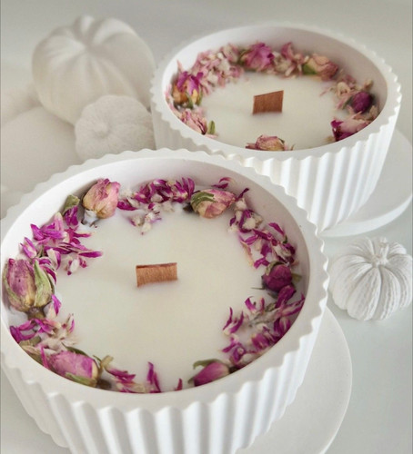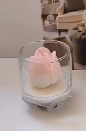 شمع گل پیونی صورتی در ظرف گرد سفید