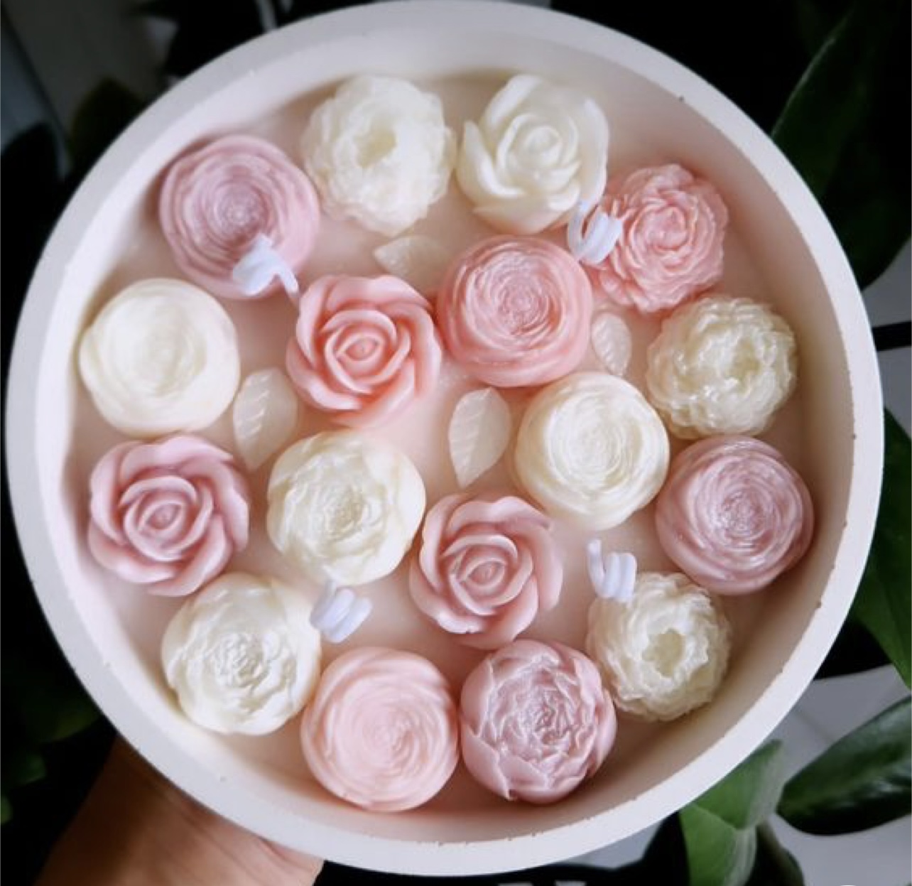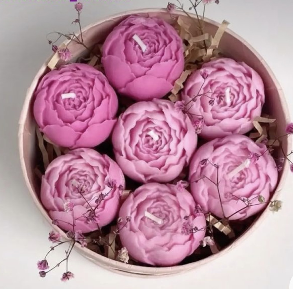 شمع گل پیونی صورتی در ظرف گرد سفید